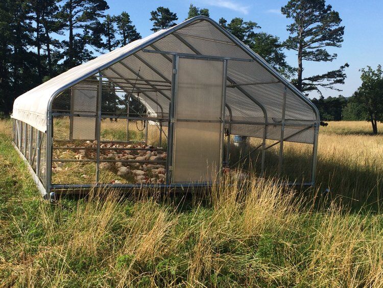 The 16′ x 24′ Schooner has 384 square feet. We brooded 300 birds in a barn until they were three weeks old, then put them in this Schooner. 384 ft² / 300 birds = 1.28 ft² per bird. In this model, you can raise up to 300 broilers or 150 layers. Each Schooner weighs 1950 lbs.