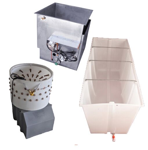 The goal: No pin feathers. Period. This only happens with a perfect scald. The Featherman stainless scalder holds a constant water temperature to help you achieve that perfect scald. Made of 16 gauge stainless steel with a 100,000 BTU propane burner, temperature control within a 5-degree range, and sized to scald 4 chickens at a time. Works well for turkeys too! Either hand dunk birds or purchase a Manual Dunker or Automated Roto Dunker.